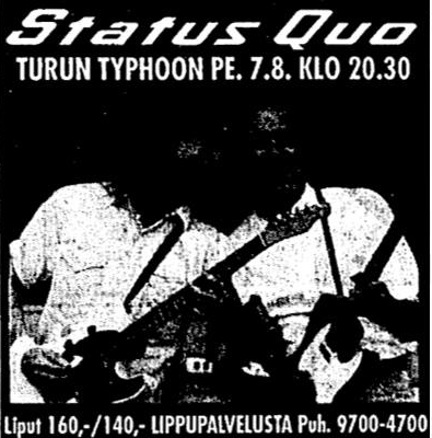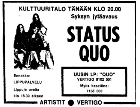 L'histoire de Status Quo, en Finlande, se résume à seulement 22 concerts, en 49 ans avec, notamment, une absence de douze années (1974 - 1986). Côté disques, le groupe recueillera 3 disques d'or, en 1974 et 1975 avant d'enregistrer des baisses conséquentes sur les ventes.